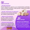 El Ajo ayuda a normalizar los niveles elevados de presión arterial, mejora la circulación sanguínea, alivia el dolor de artritis y reumas, disminuye los niveles de colesterol, refuerza las defensas del organismo, actúa como antibiótico natural, es expectorante, depurativo y un potente antioxidante.